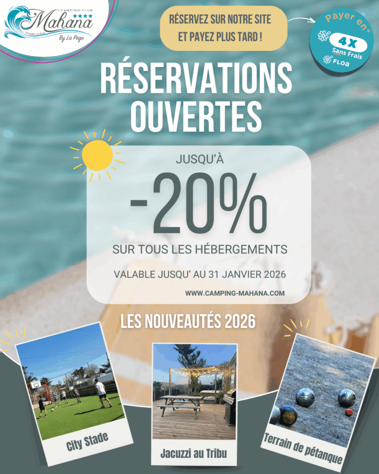 Réservez dès maintenant votre séjour au Camping Mahana by la Pège **** et vivez une expérience inoubliable en Vendée.